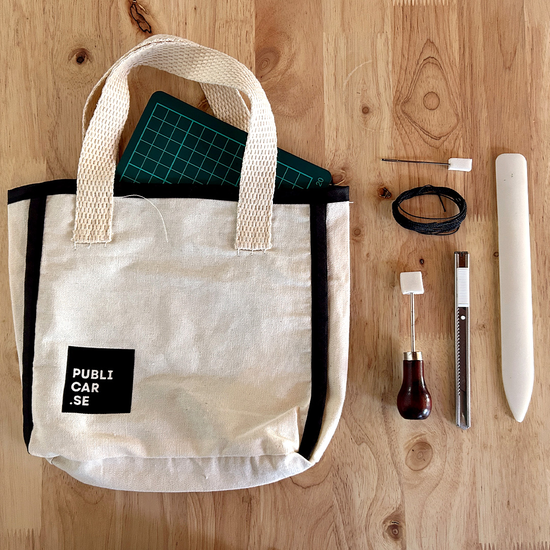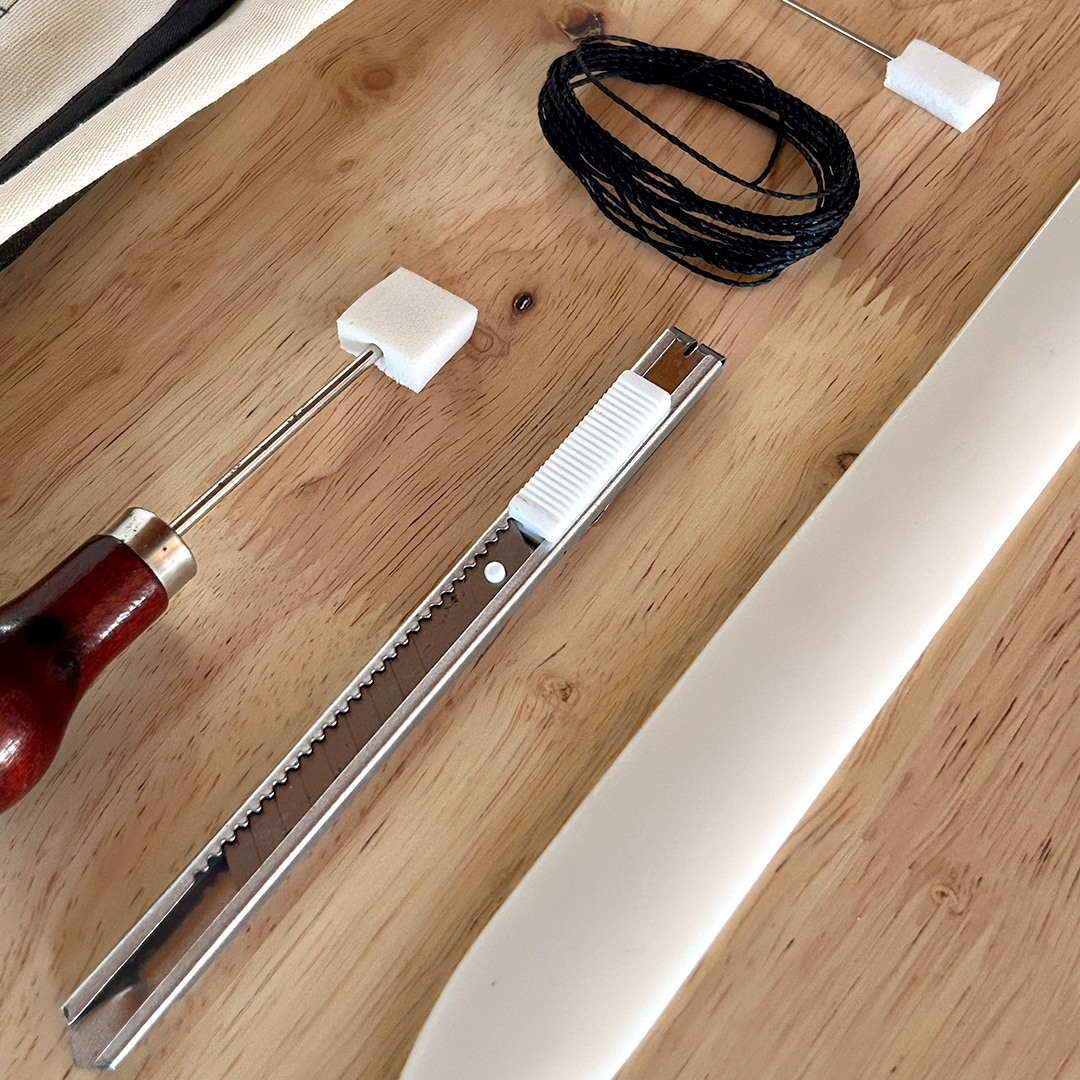 Os participantes do curso recebem pelos Correios nosso Kit de Trabalho, ele será usado na aula Mão na Massa e também no desenvolvimento da sua publicação. O Kit contém: Base de corte A5, Estilete, Dobradeira, Furador, Agulha e Fio encerado.